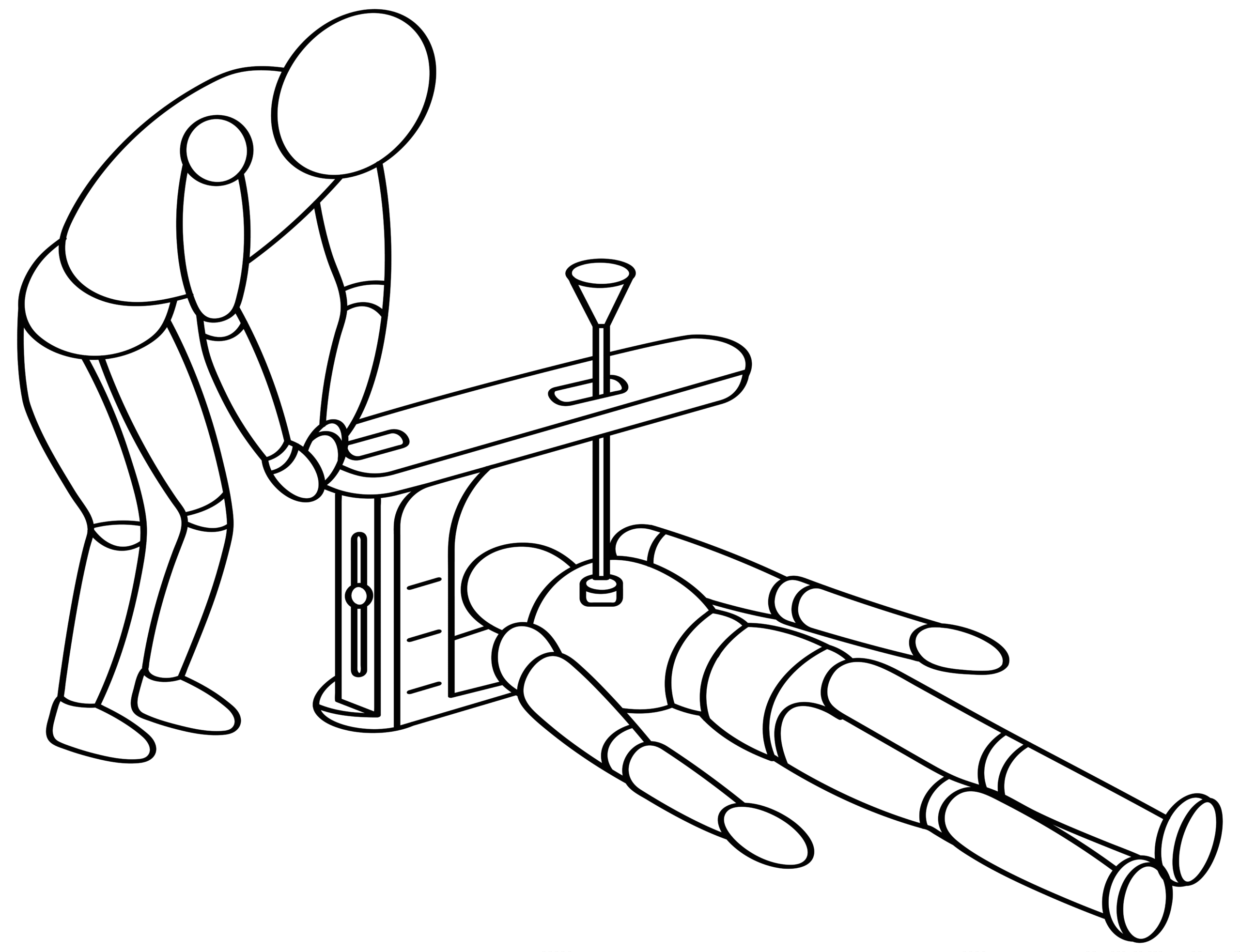 Stap 5: leg het slachtoffer zo neer dat de rug op de voet van het C-frame ligt. Het gemarkeerde kruis geeft de juiste positie weer.